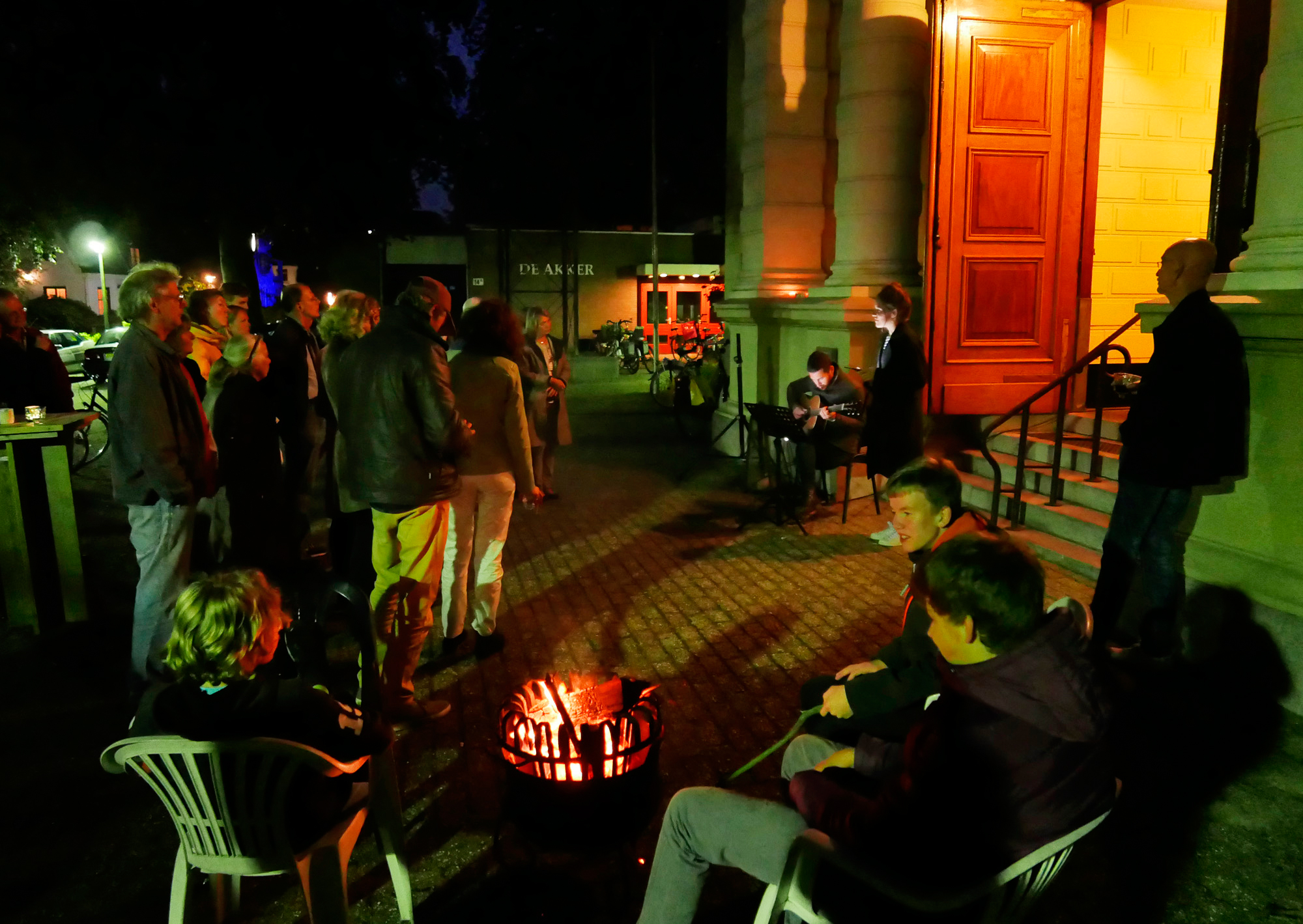 In de door kaarslicht verlichte kerk het drieluik ‘Kostbaarder dan zuiver goud’ (naar Job 28,19) van de schilder Willem Schouten, buiten op het plein gepraat, statafels, stoelen , een vuur in de avondschemering. Vanaf 22.00 uur ontrolde zich een klein programma met onder andere orgelklanken vanuit de kerk naar buiten waaiend, ‘Summertime’ en andere muziekstukken op piano en axofoon vanuit het kerkportaal,