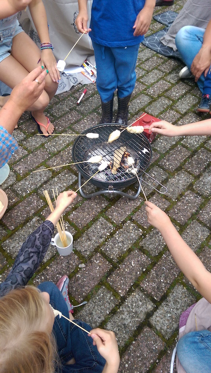 Het kerkplein had zondag 16 juli jl wel iets van een klein kampeerterreintje. Voor de grote kerkdeuren stond een aantal tenten opgezet rondom een barbeque. Met brooddeeg en marshmellows werden daarop lekkere hapjes klaargemaakt door de kinderen van de kinderkerk. In hun viering ging het over op vakantie gaan en over welke spullen dan allemaal meegaan (en dat is meestal heel wat!). En ook over of er dan wel plaats is voor Jezus. De kinderen weten het antwoord.